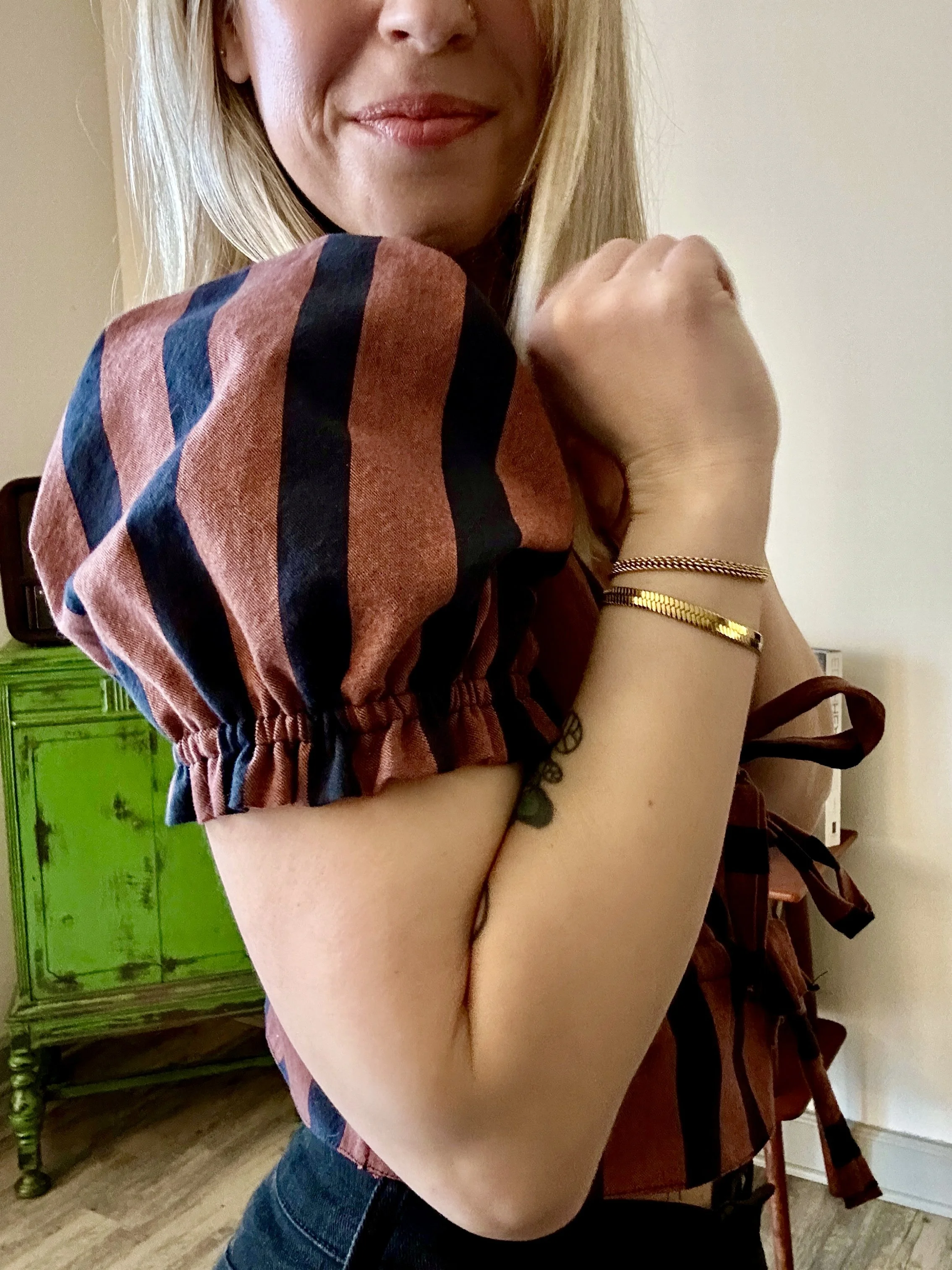 It’s raining now as I write this. My balcony door is open so my cat can enjoy watching the birds and bugs. It feels like a sweetness to me - the way nature has surrounded me as I create. On top of recovering from a career transition the past few years, another challenge for me has been navigating letting myself be seen in this space while also being a mental health therapist. How do I let myself be human, while also protecting my therapeutic relationships? I was sitting at my sewing machine one day feeling the pull to create, to express, to share my makes, to write again when I saw a fellow therapist share a picture of herself looking so free. She later said to me, “You get to be human, don’t let them take your humanity from you.” It was the permission I needed to step fully into myself again, without walls hiding my authenticity. For me, my Elliot top has been a symbol of stepping into my truth, remembering what brings me joy, celebrating my accomplishments, and savoring the space I now have to create again - physical space, energetic space, financial space, mental space - all the space. Any of them could be taken from me again, but right now, in this moment, I celebrate them.